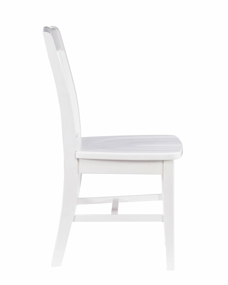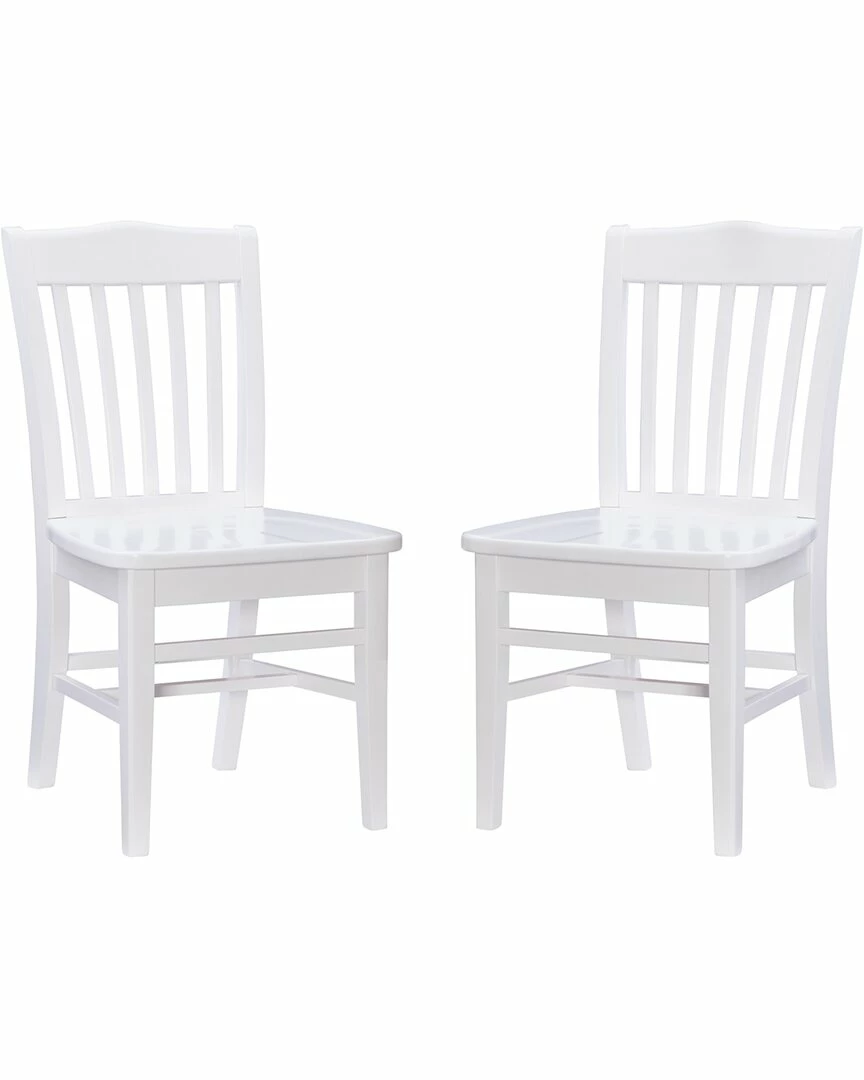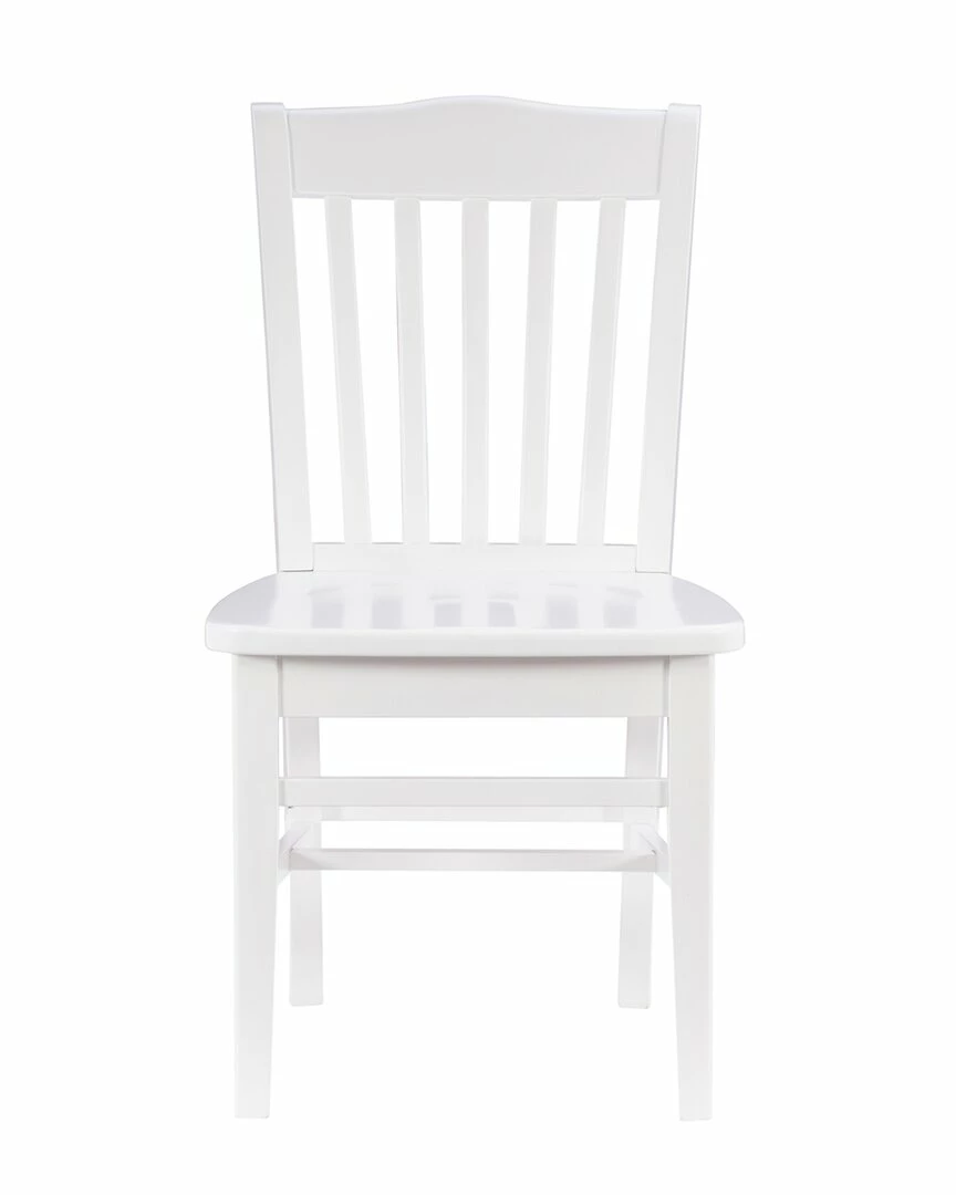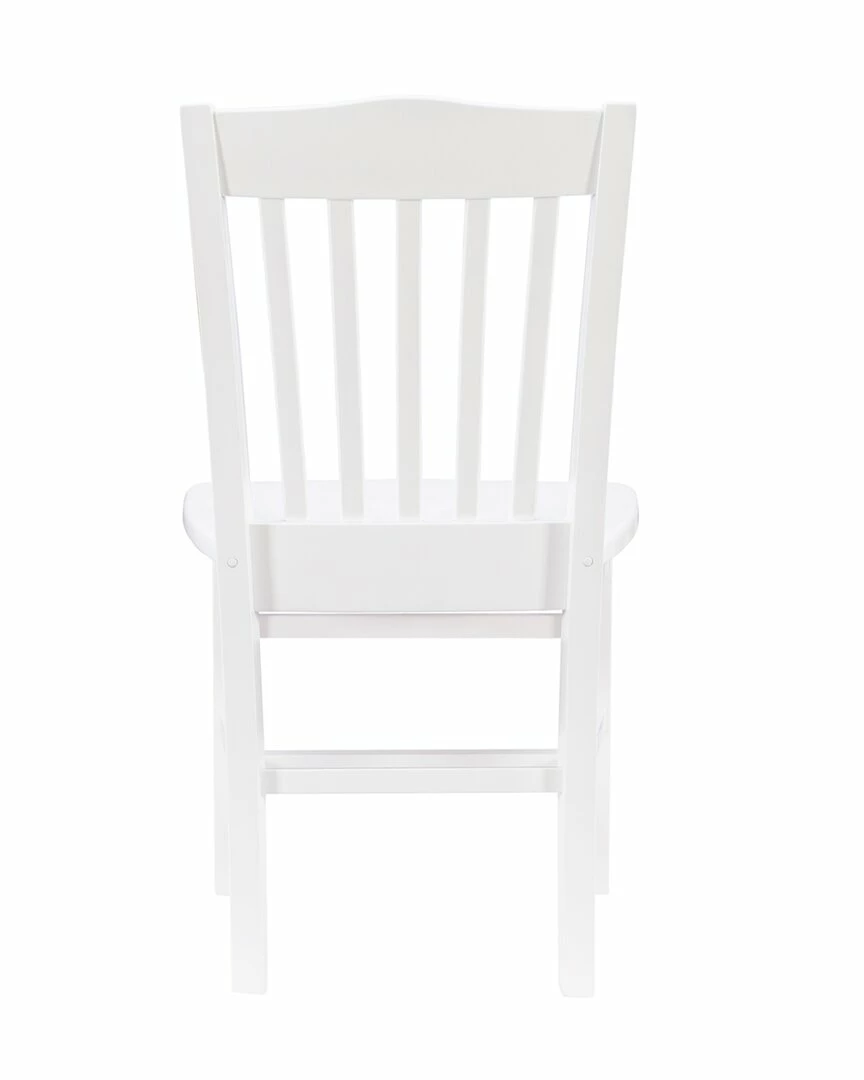 - The traditional slat back design of this farmhouse dining chair offers ample support and makes for an eye catching accent piece in a variety of cottage settings. Constructed of solid beechwood for ensured strength and stability, the frame is then painted white, sealed and sanded before receiving a glossy lacquer finish. This method provides resistance to liquid, chipping and flaking for years to come. The set of two arrives fully assembled and supports up to 300 lbs each seat.