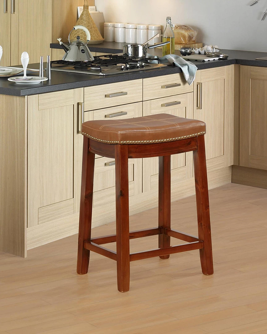 - Design details: The Claridge Cognac Counter Stool will add stylish seating to any counter or high top table. The sturdy wood frame has a dark espresso finish accented by a cognac vinyl upholstered seat. Antique bronze nailhead trim and accent stitching adds a patchwork design to the top for an eye-catching detail. 24″ Seat Height. 275 pound weight limit.