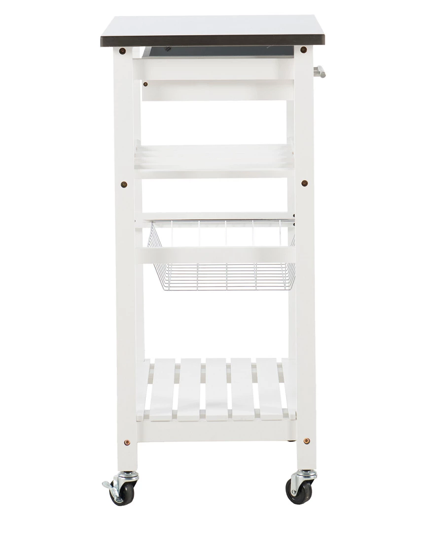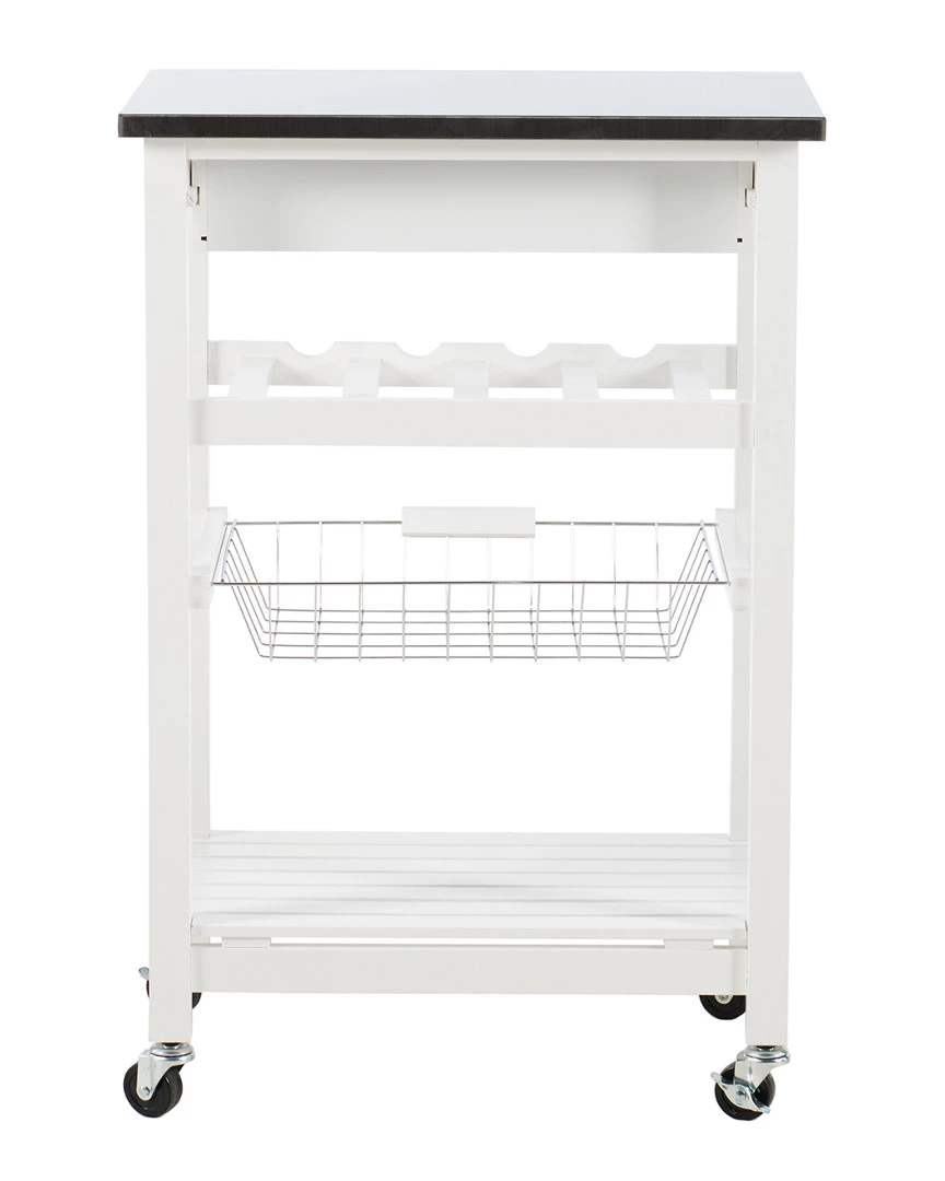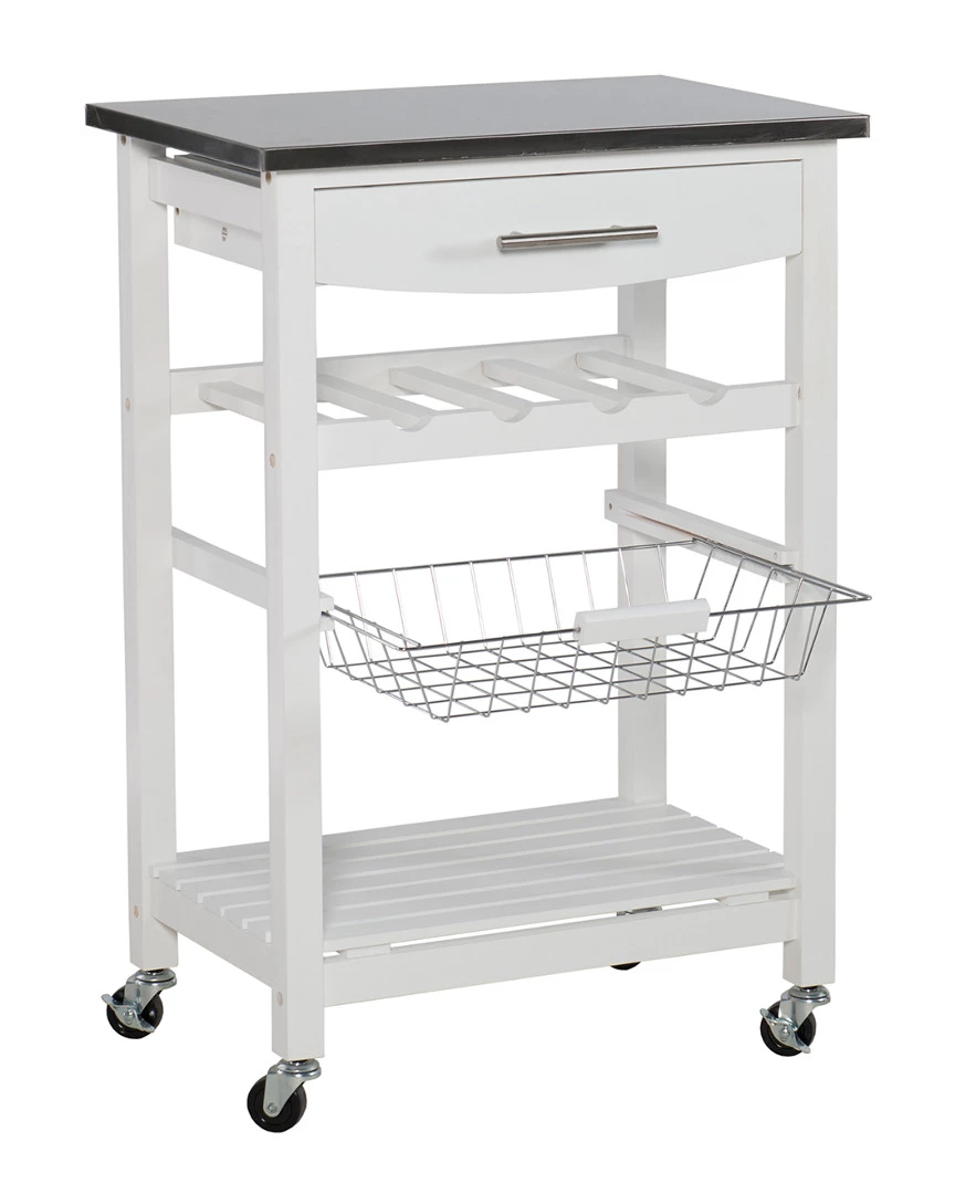 - Design details: Expand your kitchen workspace with the Clarke Kitchen Cart. A single pull out storage drawer, wire basket, wine bottle storage rack and single shelf, provide ample storage space for all of your kitchen essentials. Durable castors make for easy mobility throughout your space and lock for safety. The neutral white finish easily blends with any existing kitchen decor. Ideal for small spaces.