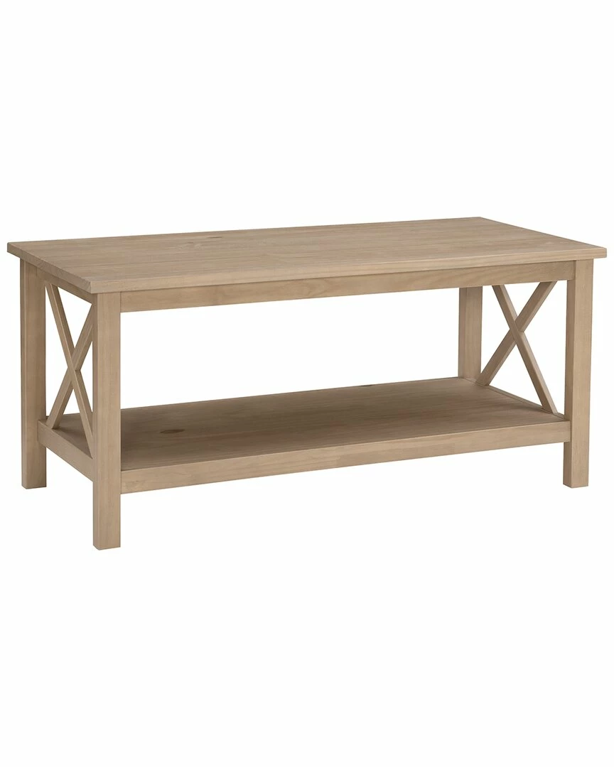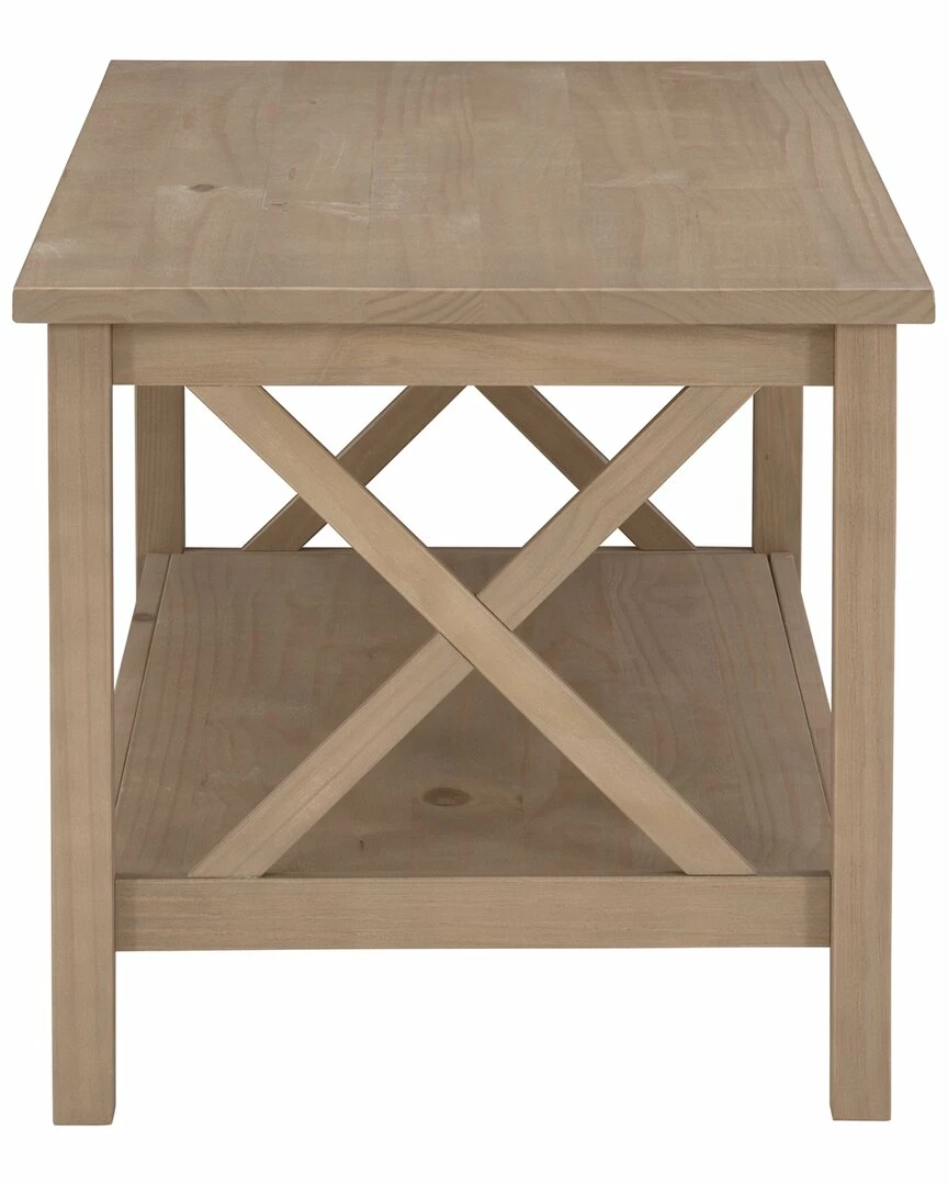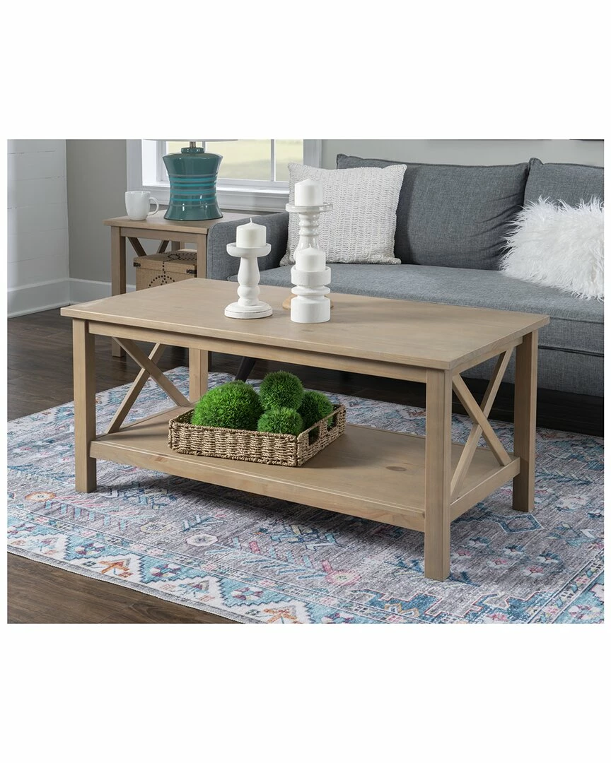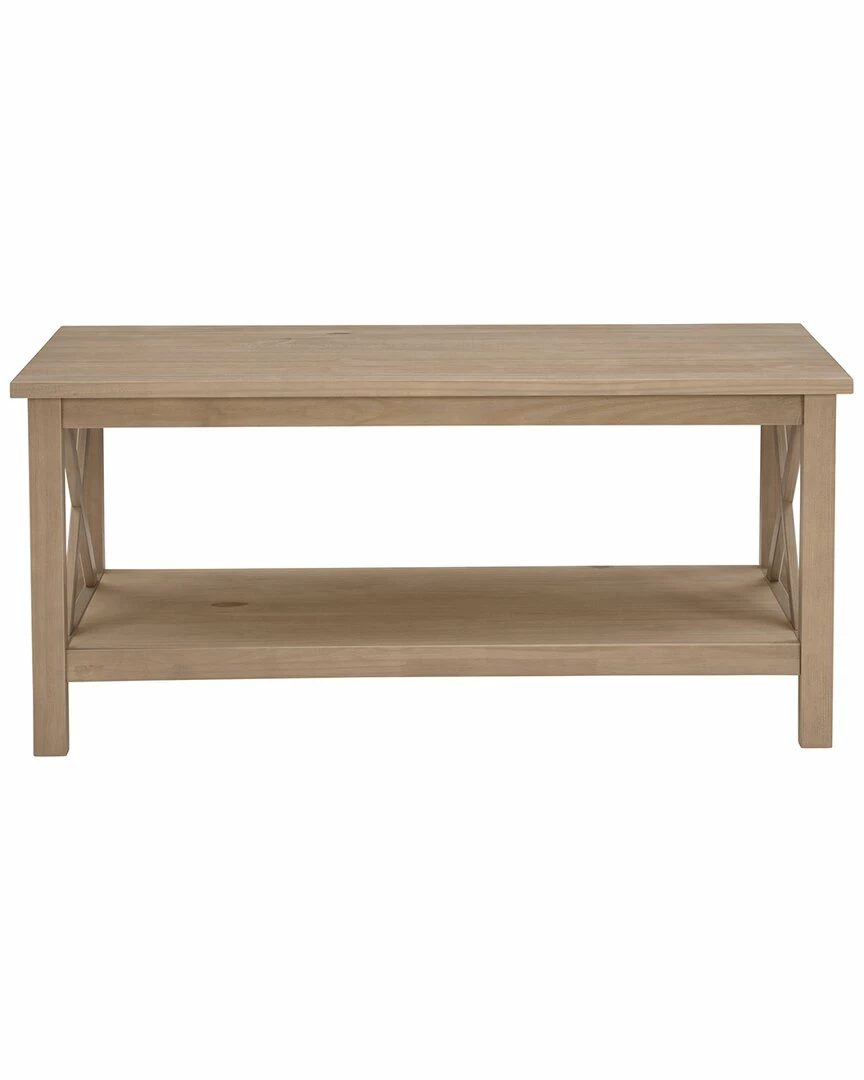 - This sturdy coffee table makes itself at home in living rooms of all shapes and styles. A welcoming and versatile centerpiece, you can use its wide, smooth surface to showcase your favorite display items or serve trays of food when guests come over. The large lower shelf offers extra storage, and the crisscross sides add interest to this modern farmhouse piece. It is crafted from solid pine with a driftwood finish that allows the beauty of the wood grain to show through. It also works perfectly as a media stand holding a TV, plus ample space below.