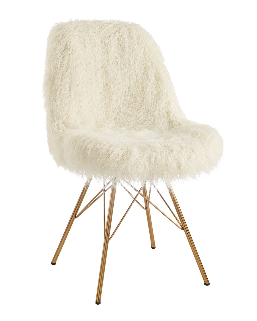 - Design details: Dramatic and bold, the Remy Faux Fur chair is a trendy addition to a bedroom, desk or living space. The chair features a cream faux fur seat and brushed gold metal legs. Perfect for adding texture, style and seating to your space.