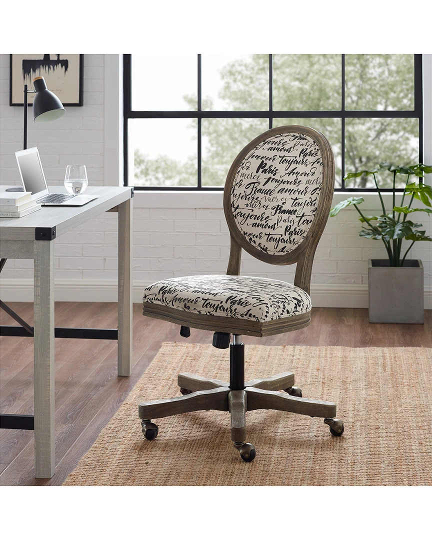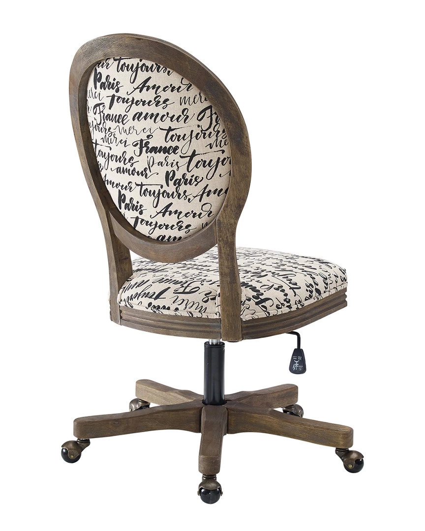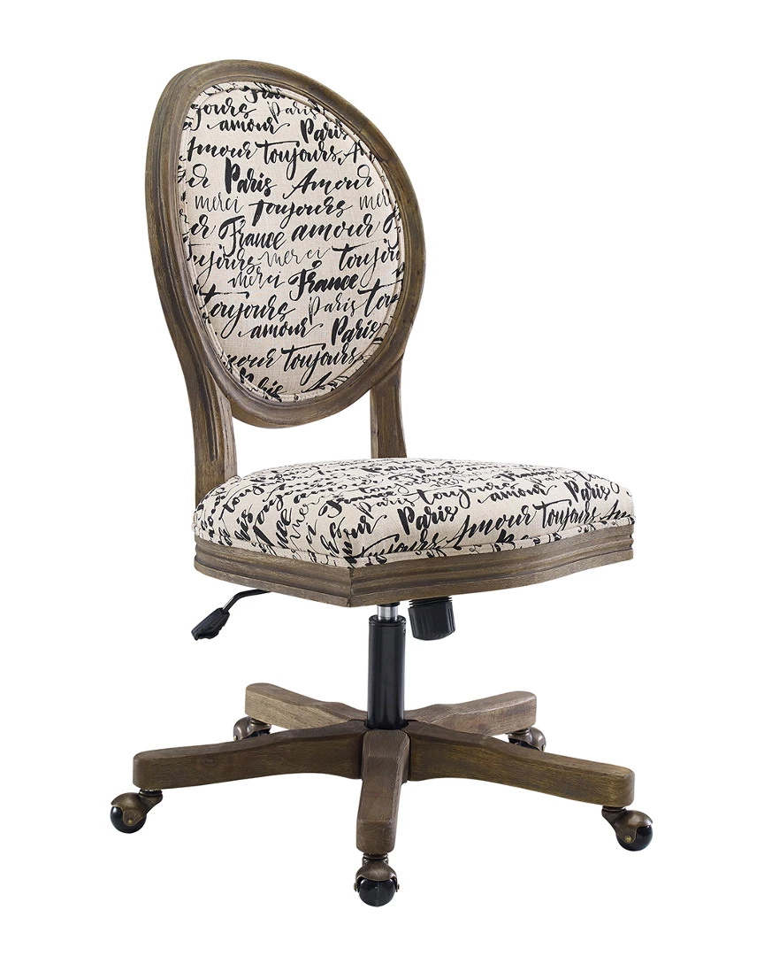 - Design details: The Erin office chair adds Parisian flare to your work space. The hardwood frame has a rustic gray finish and is upholstered in a linen blend printed fabric embellished with romantic French salutations. For mobility, there is a five point caster base as well as a gas lift to adjust height.