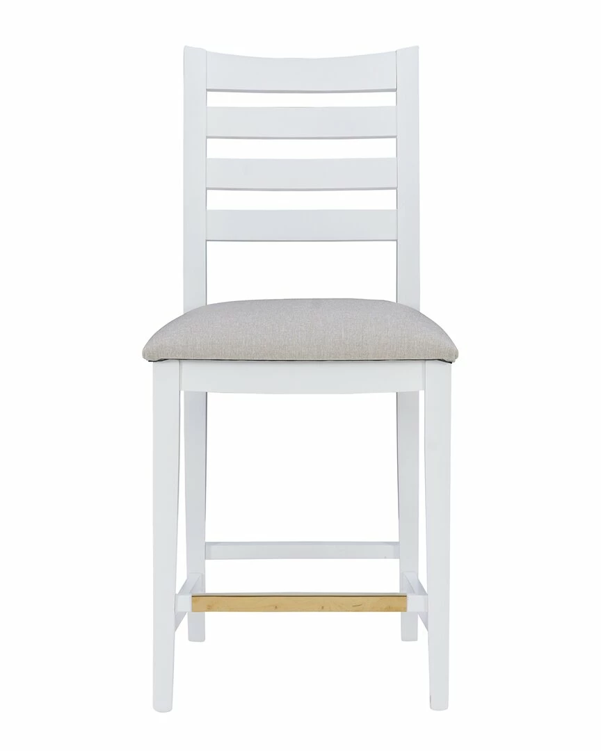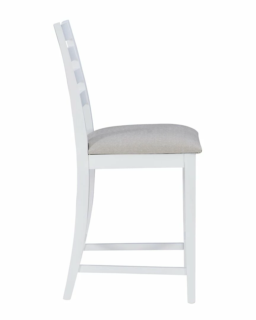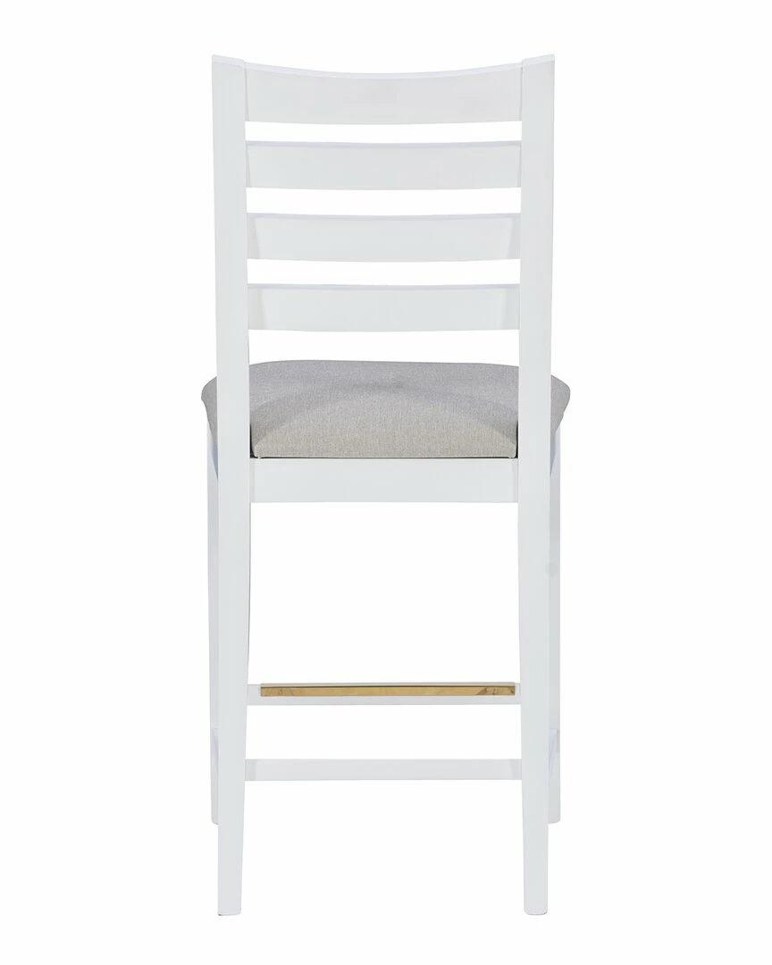 - Classy, chic, and effortlessly tiptoeing the line of traditional and modern, this ladderback counter stool is a showstopping addition to dining spaces of all kinds. Constructed of solid beechwood for ensured strength and stability, the frame is then painted white, sealed and sanded before receiving a glossy lacquer finish. The padded seat is upholstered with light grey polyester fabric for added comfort and easy cleaning. This counter stool set of two arrives fully assembled and ready to bring new excitement to your home.