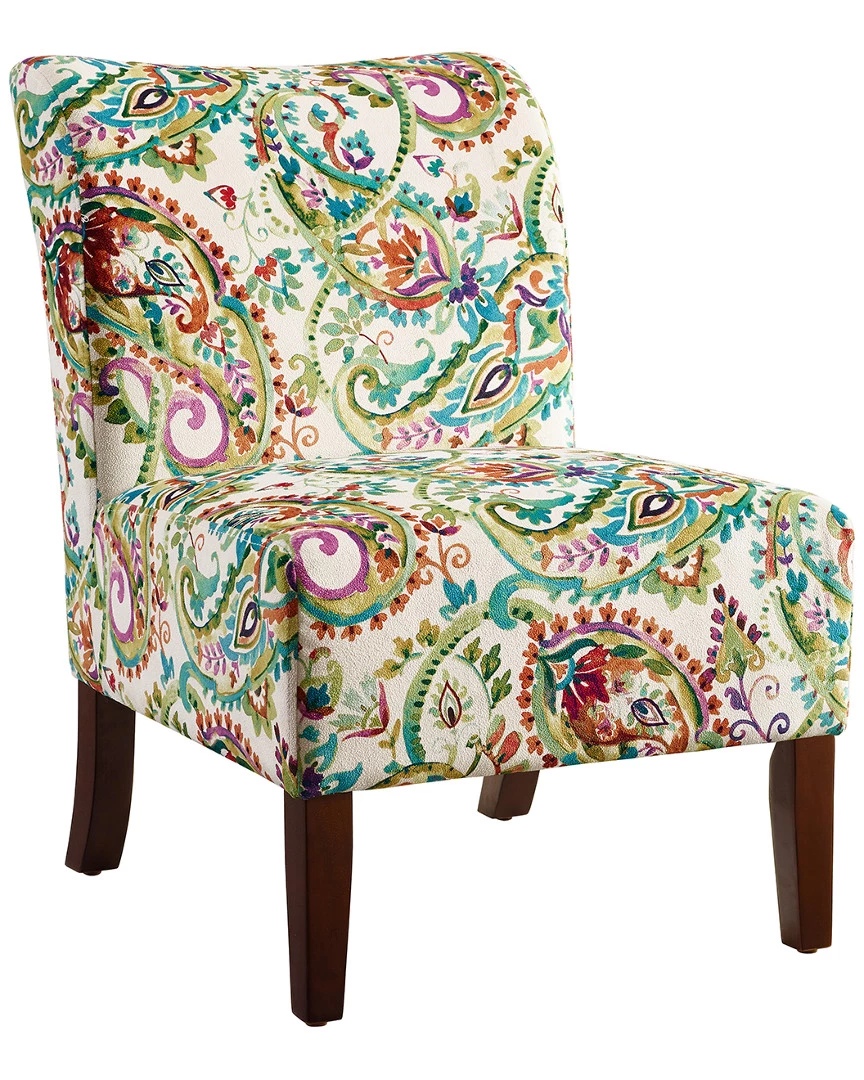 - Comfort and class come together to create this curved back slipper chair. The perfect piece for contemporary or cottage-chic styles this charming accent chair showcases a paisley print and a lovely slipper design. Gently tapered wooden legs with a dark walnut finish support this beautiful chair. Whether you’re looking for a reading chair or simply a pop of pattern this slipper chair makes a great addition to your home.