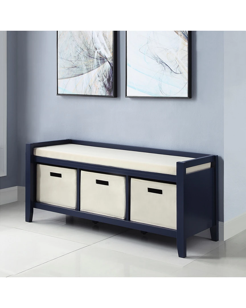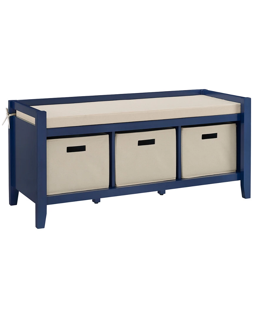 - Design details: Add seating and storage to your entry or mud room with the Luray Entryway Bench. The cream cushioned seat makes sitting comfortable, while the three storage baskets will keep shoes, jackets and more organized. The navy blue finish will add a pop of color to your space.