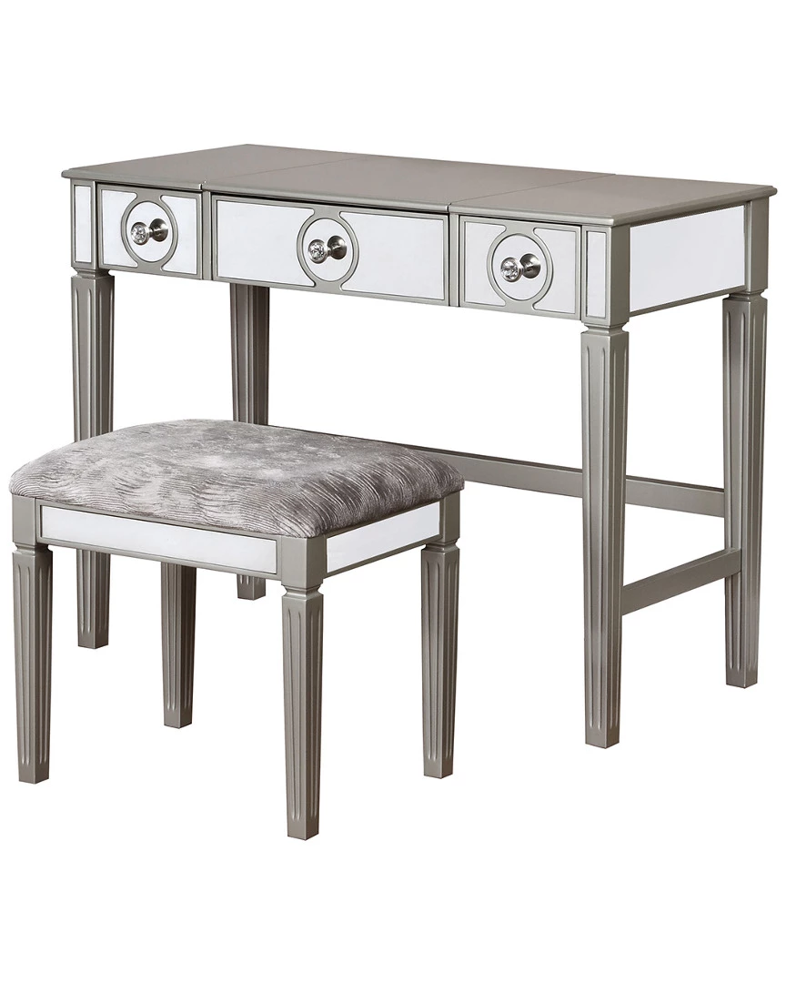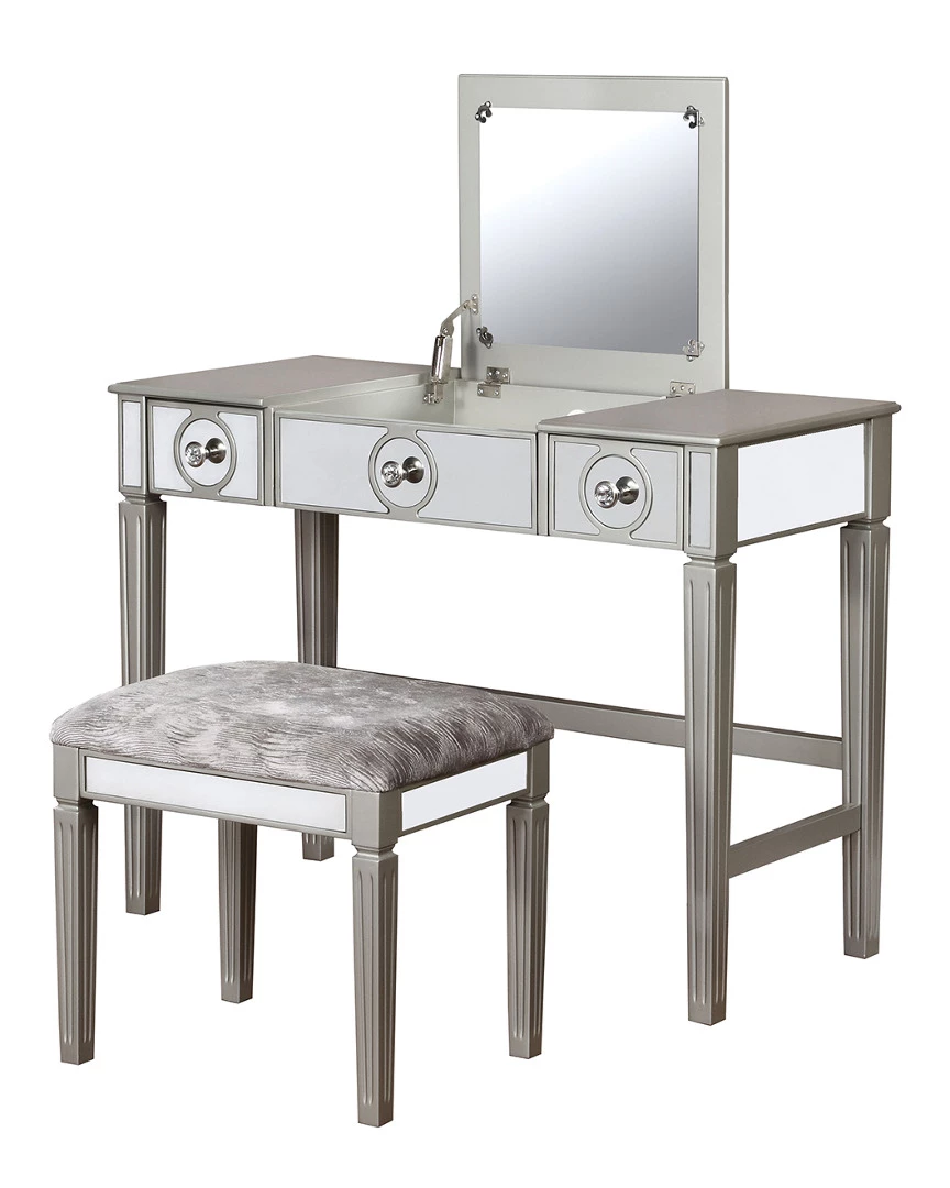 - Design details: Glamorous in design and style, the Madison Vanity Set is a stylish addition to a bedroom or dressing area. The vanity features a mirrored front accented by round silver pulls. The matching stool has mirrored details and a padded silver gray seat. Finished in an eye-catching silver, the set will add a feminine touch to any space.