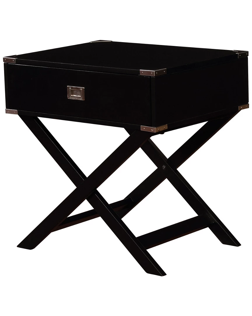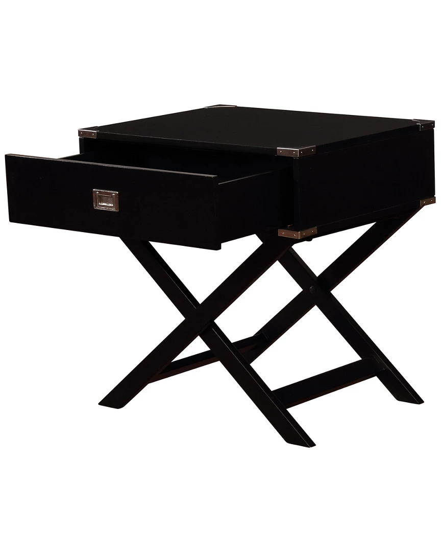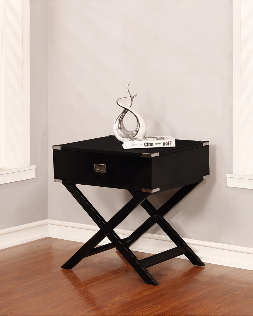 - Design details: Perfect for adding storage and display space to a bed or chair side, the Peggy X Base Accent Table is both eyecatching and fun! The X designed base complements the spacious square top. A single drawer is perfect for keeping small items contained. Silver metal accents on each corner add an extra layer of detail. The black finish is an easy addition to any space.
